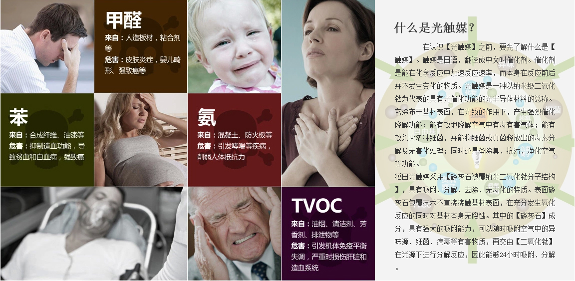 在認識【光觸媒】之前,要先了解什么是【觸媒】。觸媒是日語,翻譯成中文叫催化劑。催化劑是能在化學反應中加速反應速率,而本身在反應前后并不發(fā)生變化的物質。光觸媒是一種以納米級二氧化鈦為代表的具有光催化功能的光半導體材料的總稱。它涂布于基材表面,在光線的作用下,產(chǎn)生強烈催化降解功能:能有效地降解空氣中有毒有害氣體;能有效殺滅多種細菌,并能將細菌或真菌釋放出的毒素分解及無害化處理;同時還具備除臭、抗污、凈化空氣等功能。 稻田光觸媒采用【磷灰石被覆納米二氧化鈦分子結構】,具有吸附、分解、去除、無毒化的特質。表面磷灰石包覆技術不直接接觸基材表面,在充分發(fā)生氧化反應的同時對基材本身無腐蝕。其中的【磷灰石】成分,具有強大的吸附能力,可以隨時吸附空氣中的異味源、細菌、病毒等有害物質,再交由【二氧化鈦】在光源下進行分解反應,因此能夠24小時吸附、分解